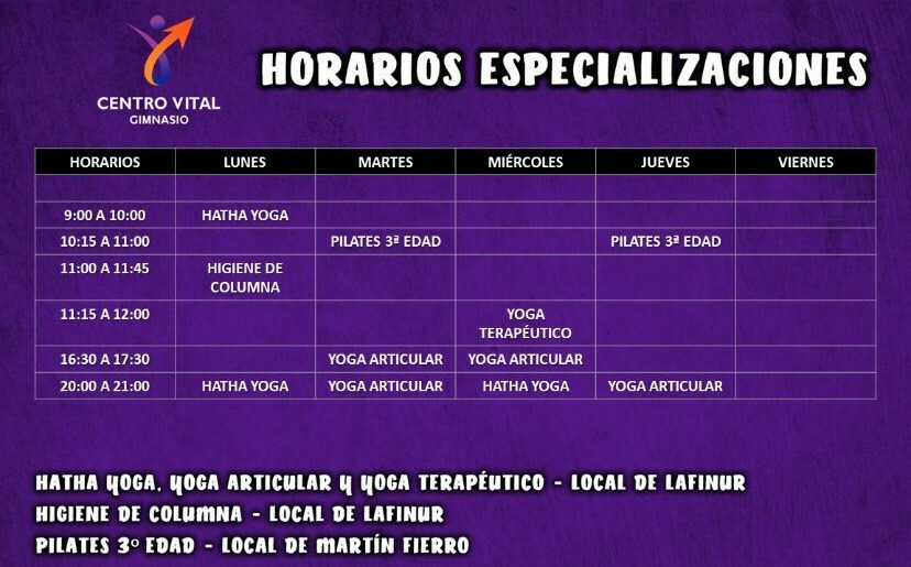 En Centro Vital Lafinur se ofrecen actividades como Pilates, Hatha Yoga y Yoga.